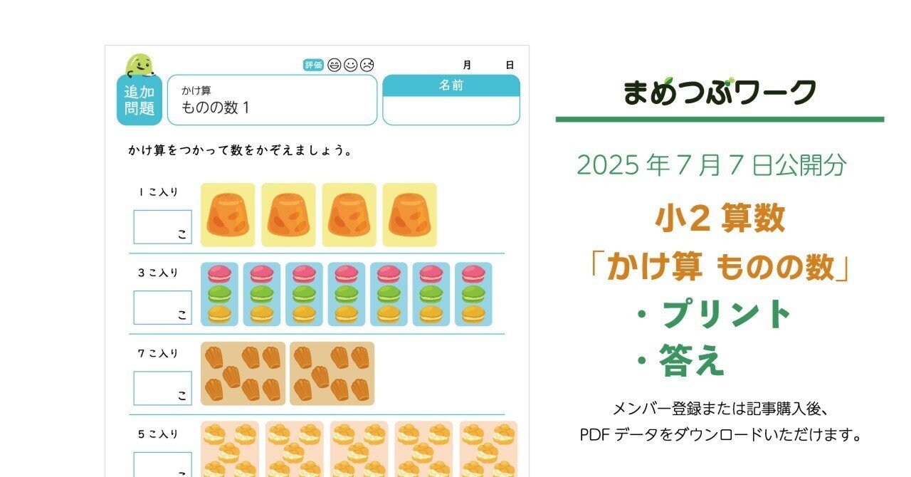 小2・算数「かけ算」のプリントです。絵をよく見て、かけ算の式をつくりましょう。イラストいっぱいの楽しいプリントを無料でダウンロードできます。