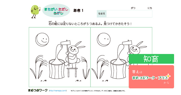 お月見・秋の虫の声・ハロウィンのイラストの間違い正しプリントです。
