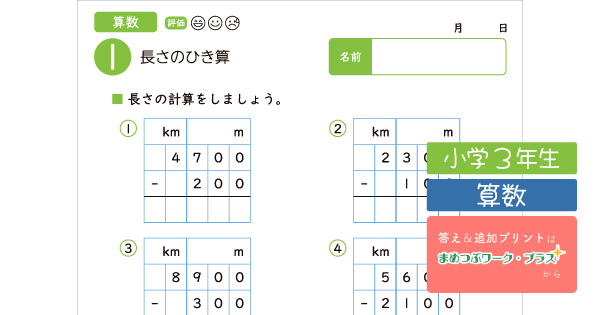 長さのひき算の筆算|小3算数プリント | まめつぶワーク