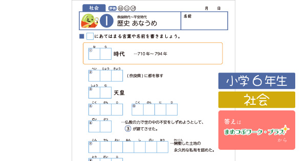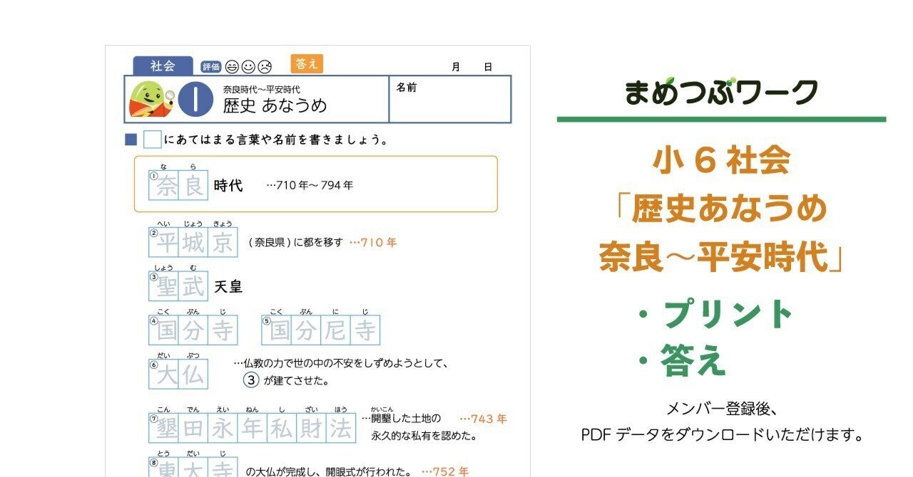 奈良時代から平安時代までの歴史用語を学べる、穴埋め形式のプリントです。