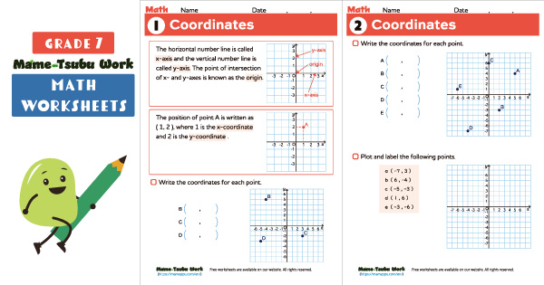 Learn how to read coordinates and plot points in the four quadrants of a graph with these math worksheets. Students will also learn important terms such as the x-axis, y-coordinates, and origin.