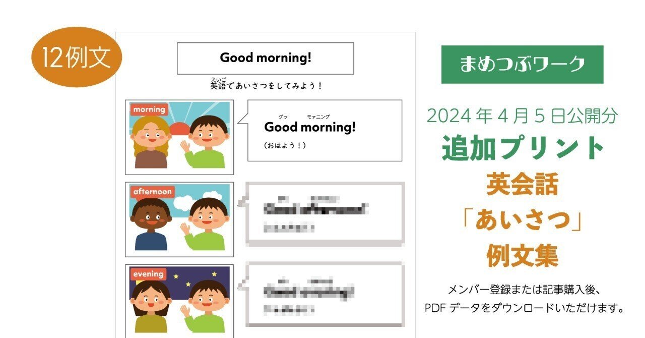 英会話プリント|挨拶【Good + 時間】(全1枚) 2024.04.05 無料でダウンロード・印刷できる英語プリントです。 朝から夜までの英語の挨拶のプリントです。 「Good + 時間」を使った挨拶表現を練習しましょう! おすすめの学年小学生・中学生 印刷方法カラー印刷推奨 スポンサーリンク ダウンロード あいさつ1 12種の例文プリントはまめつぶワーク・プラス(外部サイト)から▼ 英会話「挨拶」例文集12(全3枚)|まめつぶワーク・プラスダウンロード まめつぶワークで2024年4月5日に公開した「英会話プリント|挨拶【Good + 時間】」の追加プリントです。 【内容】 例文集3枚(PDFデータ) サンプル画像 例文集で、日常生活で使える挨拶や、別れ際に使える挨拶、友達同士... 英会話プリント【ものを借りる】はこちら▼ 英会話プリント|ものを借りる【Can I borrow~?|your・this/that】(全2枚)無料でダウンロード・印刷できる英語プリントです。「Can I borrow~?」を使って、英語で物を借りる練習をしてみましょう。赤や青のブロックを別の単語に変えるだけで、英語で「〇〇を借りてもいいですか?」と言うことができるようになります。... 英会話プリント【体調を伝える】はこちら▼ 英会話プリント|体調を伝える【I have a headache.|I・He/She】(全2枚)無料でダウンロード・印刷できる英語プリントです。「I have a ~.」を使って、英語で体調を伝える練習をしてみましょう。赤や青のブロックを別の単語に変えるだけだから、とっても簡単です。初めての英語学習にも、ぜひご活用ください。プリントの... その他の英語プリントは、サイト内検索か英語カテゴリーからご利用いただけます。 小6算数|文字と式(全3枚) 小1・国語|ひらがなの穴埋め1(全5枚)
