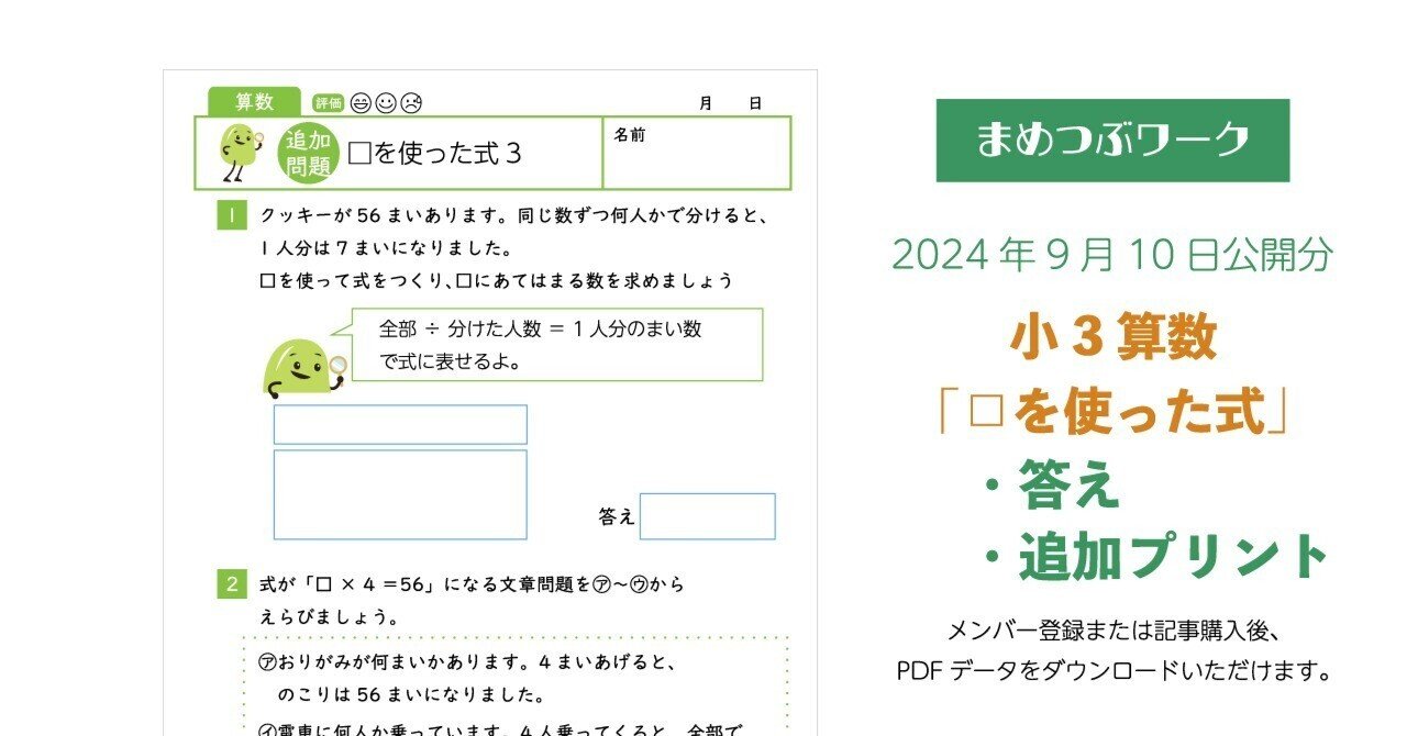 - 文章問題にて、分からない数がある場合にも、□を使えば式に表すことができることを確認しましょう。