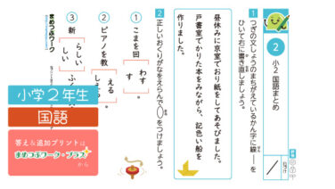 小学2年生の国語のまとめプリントです。言葉の仲間分け、漢字の読み取り・書き取り・送り仮名、長文読解、反対の意味の言葉を復習しましょう。