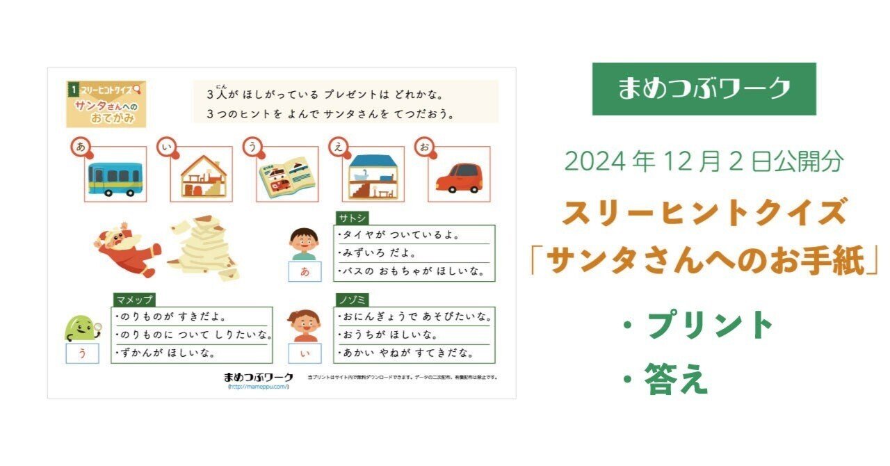 クリスマスのスリーヒントクイズ・サンタさんへのお手紙|幼児・知育プリント | まめつぶワーク